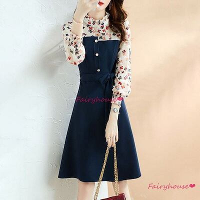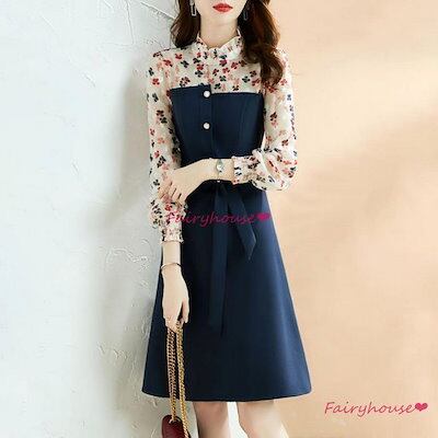 シャツワンピース レディース 40代 きれいめ ワンピース 秋服 長袖ワンピース 切り替えシフォン花柄 Aラインスカート オシャレ大人 体型カバー 通勤 30代50代
