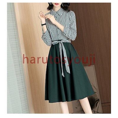 ワンピースレディース40代秋シャツワンピースきれいめフォーマルワンピース長袖ドッキングワンピースベルト付き大人上品Aラインワンピース着痩せ