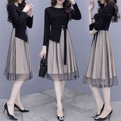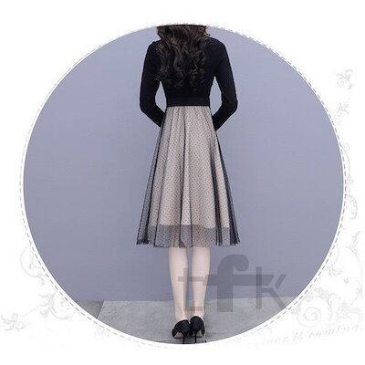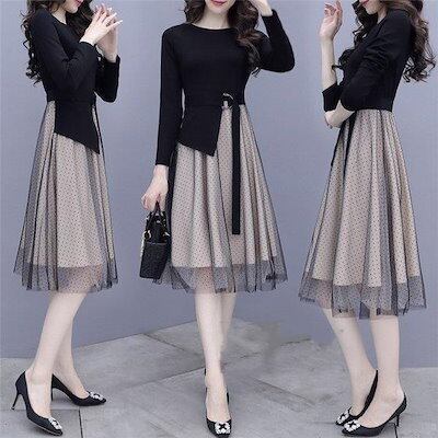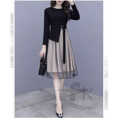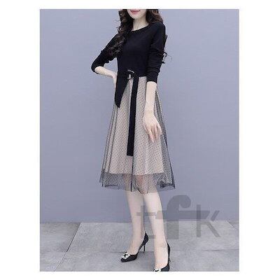 ワンピース ひざ丈ワンピース レディース Aライン 長袖 膝丈 着痩せ 春秋 フォーマル 結婚式 ワンピ チュールスカート コーデ 30代 40代 50代 通勤 OL