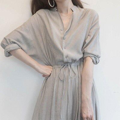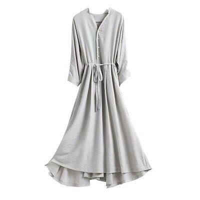 ワンピース レディース ロング丈 マキシ リネン ベルト お洒落 Aライン Vネック チュニック 長袖 無地 着痩せ きれいめ ゆったり 大きいサイズ
