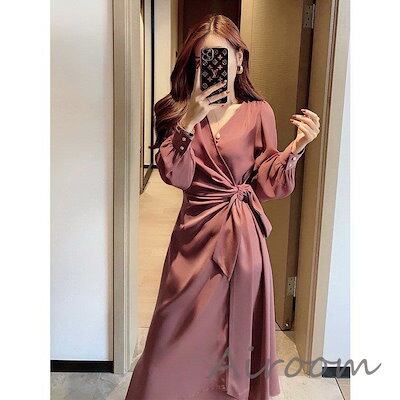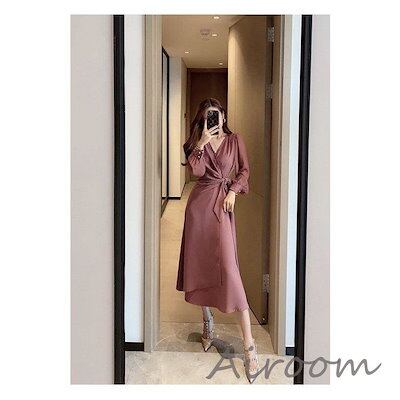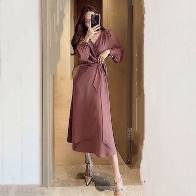 ワンピース レディース 春秋 キレイめマキシ丈ワンピース 長袖 無地シフォンワンピース パフスリー