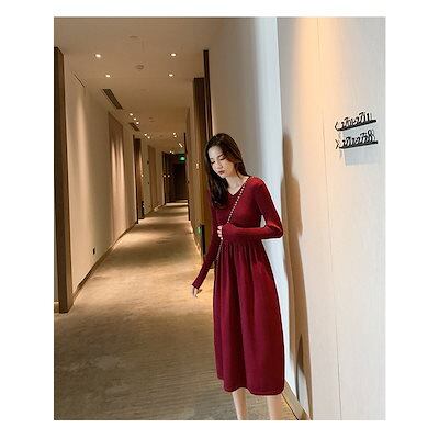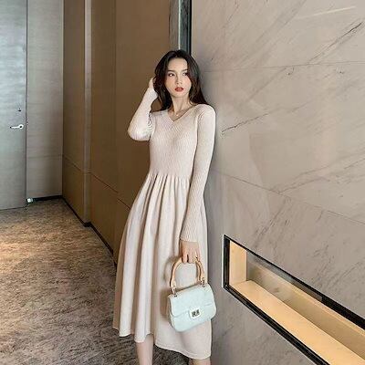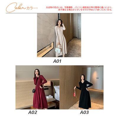 ニットワンピース レディース Vネック 秋冬 長袖 Aライン フレア 通勤 ワンピース ニット ロング丈スカート ニットインナー セーター オシャレ