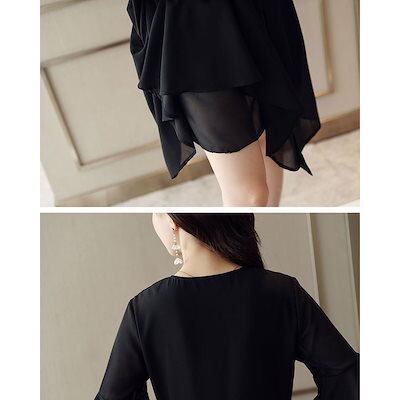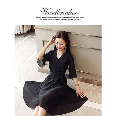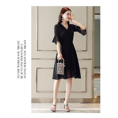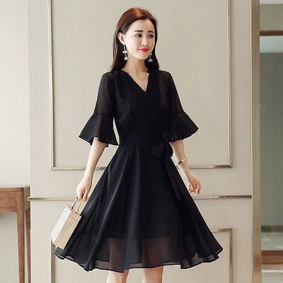 ワンピース レディース ひざ丈 膝丈 Vネック Aライン 体型カバー フレア 5分袖 五分袖 無地 フォーマルワンピース ブラック シフォン 40代 50代