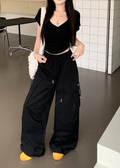 2024春夏パンツ ロング丈 ポケット ワイド ストレート ウエストゴム ハイウエスト 美脚効果 脚長効果 細見え 夏 白 黒 おしゃれ かわいい 韓国ファッション レディース お出かけ