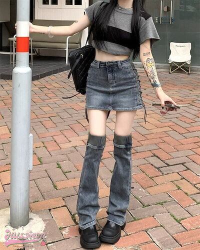 デニム ミニスカート 2点セット デニムスカート ミニ丈 ハイウエスト ジーンズ 加工 カジュアル ミニ丈 美脚 脚長 レディースファッション 系