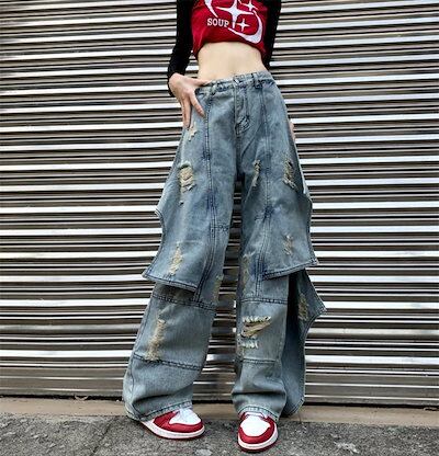 2024夏 韓国 4XL展開 ワイド デニムパンツ ボトムス ストレート パンツ ロゴ ズボン ファッション系加工韓国 レディース カジュアル パッチワーク 学生 スタイルアップ 色っぽ 女っぽ