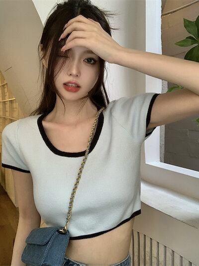 2024 春夏 甘い トップス Tシャツ ラウンドネック丈 休日 フレンチ 韓国系コーデ ブラウス ファッション タイト スリムフィット丈短め ショート レディース 休日 おしゃれ T