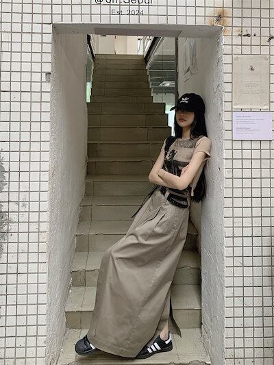 2024 春夏スカート ロング丈 Aライン スリット フロントオープン ハイウエスト 美脚効果 脚長効果 細見え 夏 カーキ おしゃれ かわいい 韓国ファッション レディース お出かけ