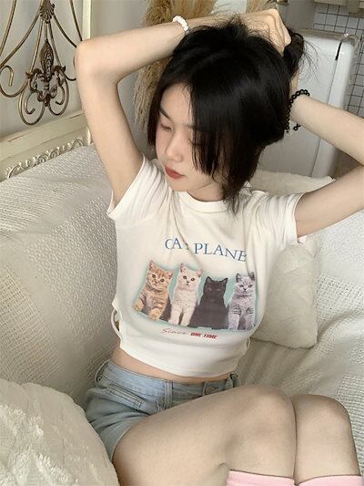 2024 春夏トップス プリント半袖 Tシャツ 韓国 ラウンドネック スリム かわいい ショート おしゃれスリーブ カジュアルセットアップコーデ丈 ファッションレディース フレンチお出かけ T