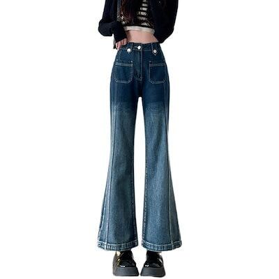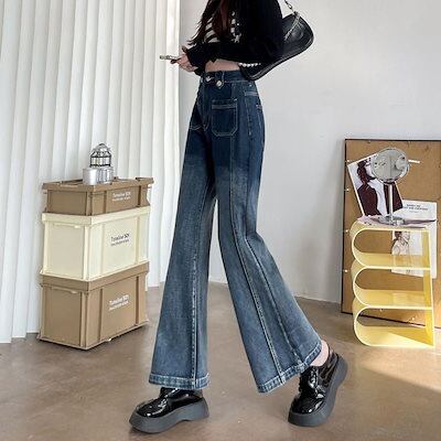 ワイドパンツかっこいい!グラデーション レディースジーンズ ハイウエスト 春秋 ストレートパンツ 9分/8分 フレアパンツ デニム