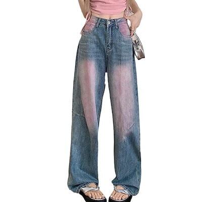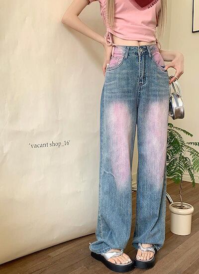 ジーンズ ロング丈 ピンク ワイド ストレート ハイウエスト 脚長 美脚 効果 カジュアル ストリート 韓国ファッション ワイドパンツ レディース