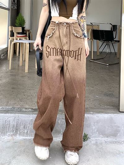 デニムボトムス ジーンズ アメリカン レトロ ローエッジ ストレート ジーンズ レディース 夏 痩身 モップ デザイン ズボン 個性 ワイドレッグ パンツ トレンド