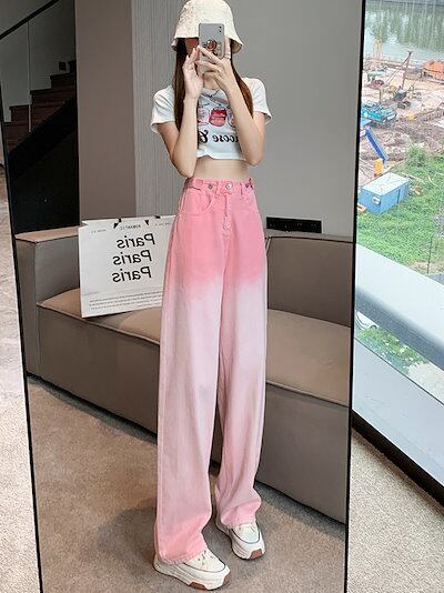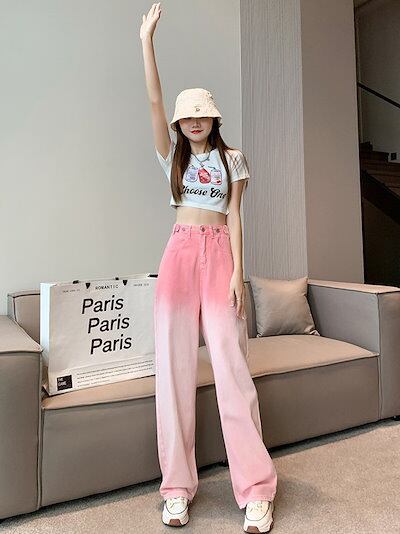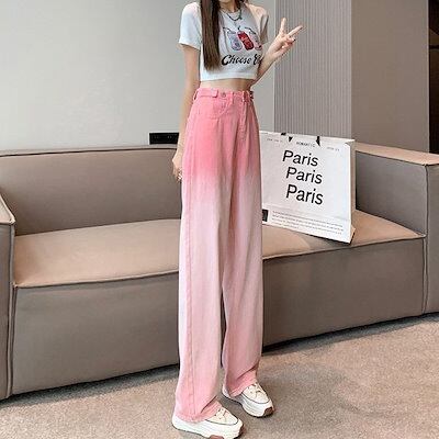 デニムボトムス ジーンズ ストレートレッグ ジーンズ レディース 春 オールマッチ ハイウエスト ピンク グラデーション デザイン ウエスト ワイドレッグ ドレープ モップパンツ