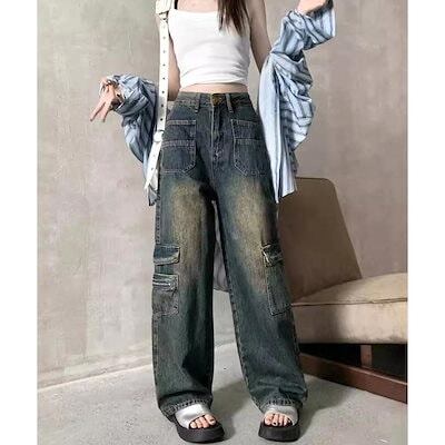 ワイドパンツ ウォッシュデニムカーゴパンツ レディース