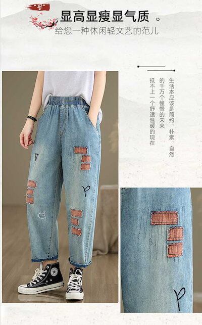 「ファットガール」 夏 薄手 ジーンズ 刺繍柄 デニムパンツ ゴム 八文丈 レディース ワイドパンツ スラックス 体型カバー 大きいサイズ ゆったり