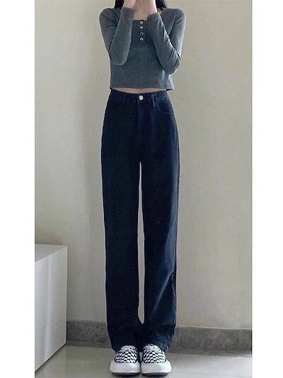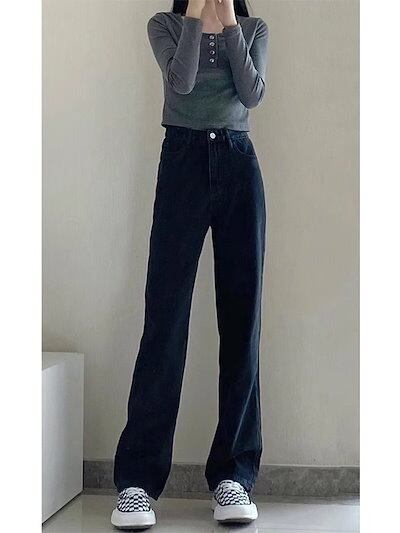 ブラック デニムボトムス レディース ハイウェスト ワイドパンツ ゆったり ジョガーパンツ 着痩せ