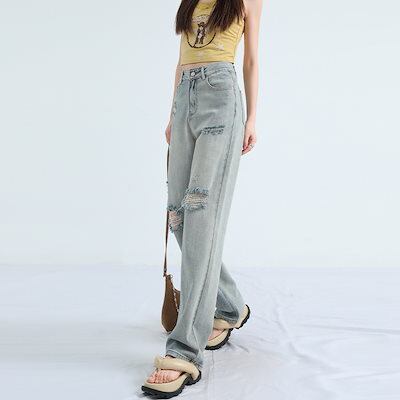 ダメージジーンズ レディース ハイウェスト ワイドパンツ 春夏 着痩せ ストレート モップパンツ