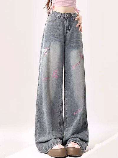 hello kitty プリント レディース 春秋 新しい ハイウエスト ジーンズ ワイドレッグパンツ ゆったり デザインセンス ワイドパンツ