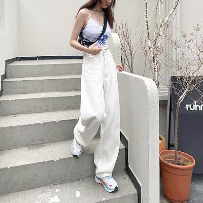 脚長効果!スキニーパンツ ホワイト ワイドパンツ デニムパンツ レディース 春 新商品 ハイウェスト 着 痩せ ゆったり エクストラログ丈 ストレートパンツ モップパンツ