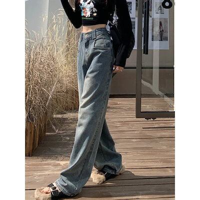 スラックスパンツ ヴィンテージ ストレート デニムパンツ レディース 秋 アメリカンスタイル ハイウエスト ルーズ ワイドパンツ ズボン 韓国