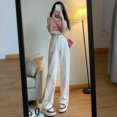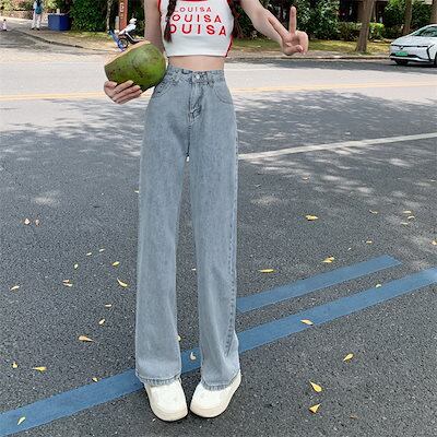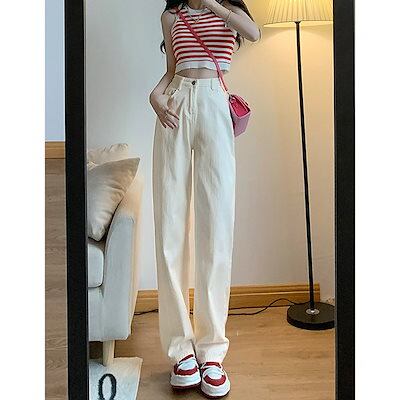 デニムパンツ ヴィンテージ ハイウエスト ワイドパンツ ジーンズ レディース スモール ルーズフィット ストレート ドレープ モップズボン 韓国