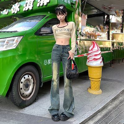 2025 初秋 デニムパンツ パンツ デニム ジーンズ ワイド ストレート ハイウエスト 脚長効果 美脚効果 細見え ウォッシュ加工 カジュアル おしゃれ かわいい レディース 韓国ファッション