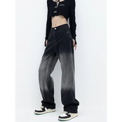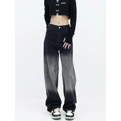 脚長効果!デニムパンツウォッシュドグラデーションストレートジーンズレディースハイウエスト細身ワイドパンツパンツ