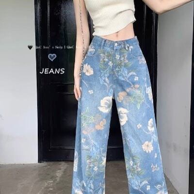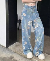 2024 春夏パンツ デニム ジーンズ ロング丈 ワイド ストレート 花柄 ハイウエスト 美脚効果 脚長効果 細見え 夏 おしゃれ かわいい ガーリー キュート 韓国ファッション レディース お出かけ