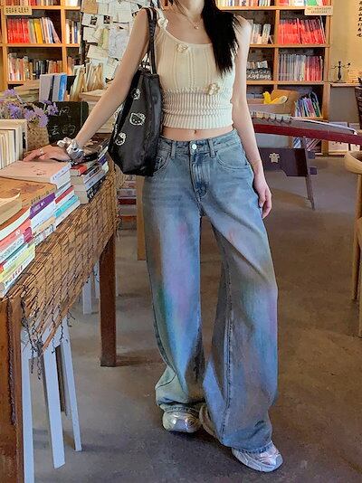 2024春夏パンツ デニム ジーンズ レインボー 虹色 ワイド ストレート ハイウエスト 脚長効果 美脚効果 細見え 春 カジュアル おしゃれ かわいい 韓国ファッション レディース お出かけ