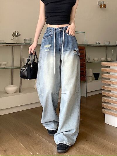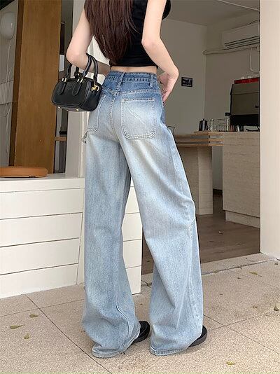 2024春夏パンツ デニム ジーンズ グラデーション ワイド ストレート ハイウエスト 脚長効果 美脚効果 細見え 春 カジュアル おしゃれ かわいい 韓国ファッション レディース お出かけ