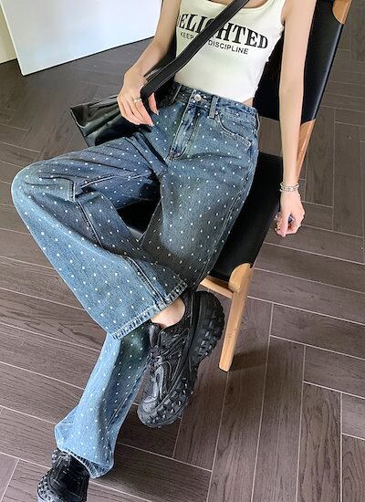 2024春夏パンツ デニム ジーンズ ドット柄 ワイド ストレート ハイウエスト 脚長効果 美脚効果 細見え 春 カジュアル おしゃれ かわいい 韓国ファッション レディース お出かけ
