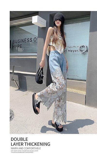韓国 美脚 ファッション ボトムス ワイドパンツ デニムパンツ 夏 ロングパンツ レース 切り替え パンツ ゆったり ストレート ジーンズ ズボン