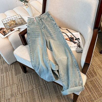 春秋新作 ガウチョパンツ ライトブルー ストレートシリンダ ジーパン ゆとりがある 韓国ファッション ハイウエスト ワイドパンツ レディース