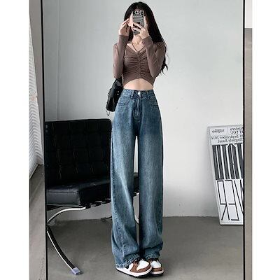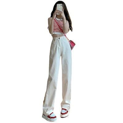 デニムパンツ 美脚 レディース ボトムス ジーンズ 秋ゆったりストレートドレープパンツ 小柄 女性 ハイウエストワイドデニム ホワイト デニムボトムス