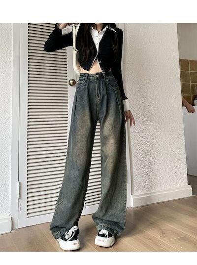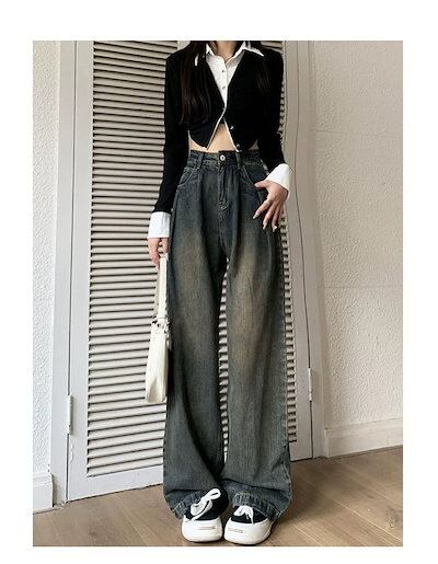 裏起毛パンツグレージーンズレトロプリーツワイドパンツジーンズレディースゆったりハイウエスト着痩せ ストレートジーンズひんやりボトムス