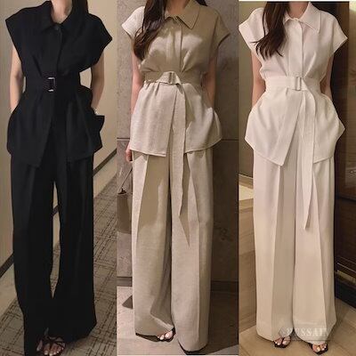 セットアップ トップス シャツ 半袖 襟 ベルト ロングパンツ ワイド ストレート 細見え ハイウエスト フォーマル きれいめ 大人っぽい おしゃれ 夏 韓国ファッション レディース お出かけ