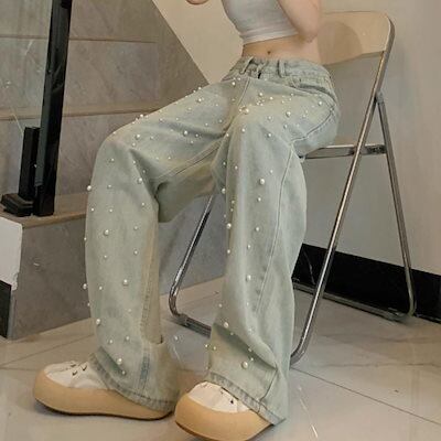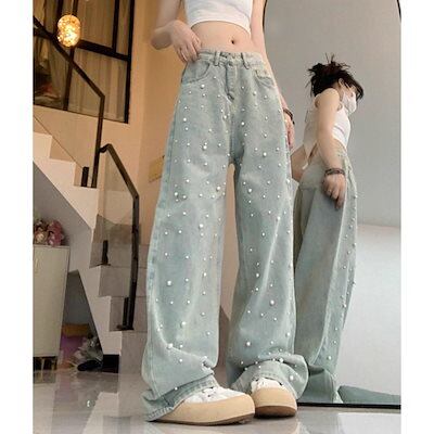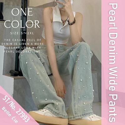 デニムパンツ パール使い デニム ワイドパンツ レディース ストレート 可愛い きれいめ かわいい シンプル ユニーク Gパン ジーンズ