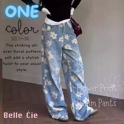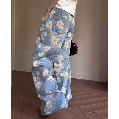 デニムパンツ フラワー ワイドパンツ レディース ジーンズ デニム ジーパン ストレート ワイドデニム プリント 総柄 花柄 韓国ファッション
