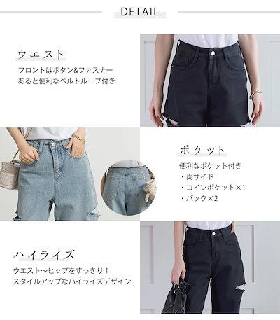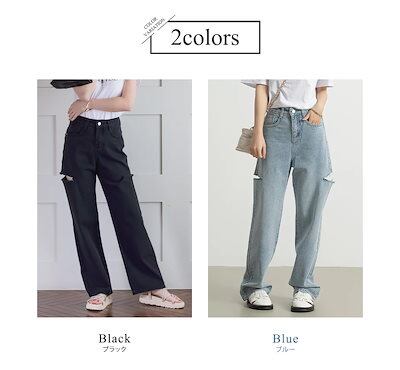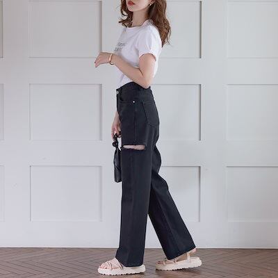 デニム パンツ レディース サイドカット おしゃれ 黒 ゆったり ロングパンツ ワイドパンツ 大きいサイズ 小さいサイズ サイドスリット カッティング ダメージ ワンポイント 中厚手 ベル