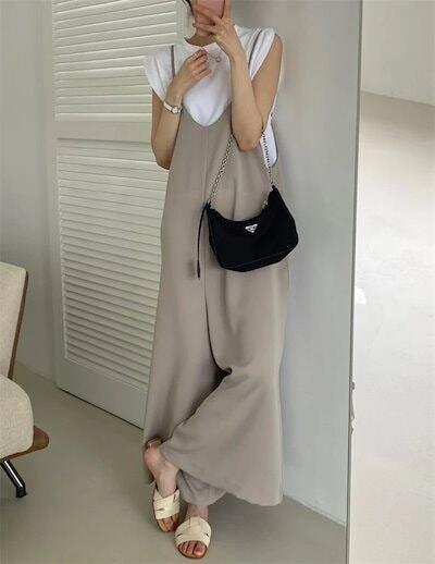 オールインワン サロペット ロングパンツ レディース ワイドパンツ シフォン 落ち感あり ポケット フレア キャミ 春夏秋 ゆったり 体型カバー 大きいサイズ 着?せ 大人 シンブル カジュアル お