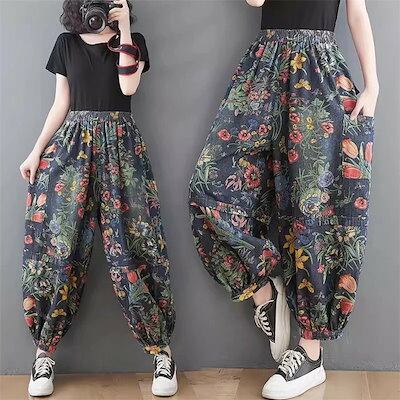 デニムパンツ 花柄 バルーンパンツ 夏 レディース デニムワイドパンツ 大きいサイズ ゆったり 9分丈 花柄 ジーンズ コクーンパンツ 柔らか ボトムス ジーパン 美脚 春夏秋 森ガール ウエストゴム
