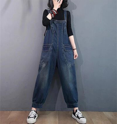 デニムサロペット レディース コーデ 春秋 サロペット デニム 大きいサイズ ワイド パンツ オーバーオール ロング 体型カバー ゆったり 楽ちん 大人 デニムワイドパンツ 春 夏 秋 無地 着痩せ