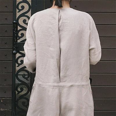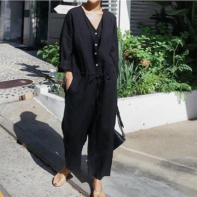オールインワン レディース サロペット 九分丈 春 夏 ゆったり パンツドレス つなぎ オーバーオール 綿麻 パンツ ワイドパンツ ワイド クルーネック ポケット 無地 コットン 涼しい 体型カバー