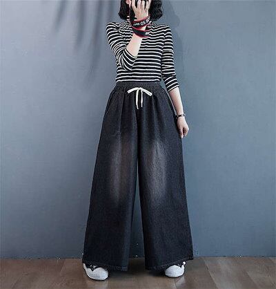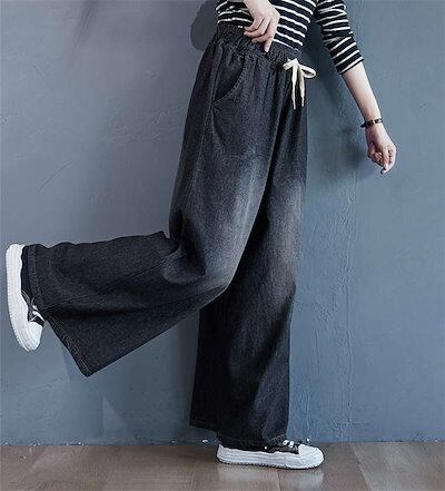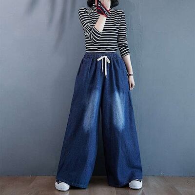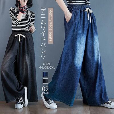 パンツ ワイドパンツ デニム レディース デニムワイドパンツ 大きいサイズ ガウチョ ガウチョパンツ 春 夏 無地 ロング丈 ロングパンツ ポケット付き ウエストゴム リボン付き ボトムス リラックス