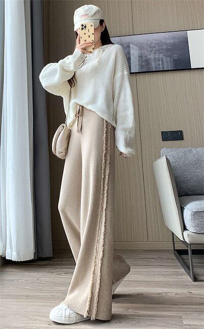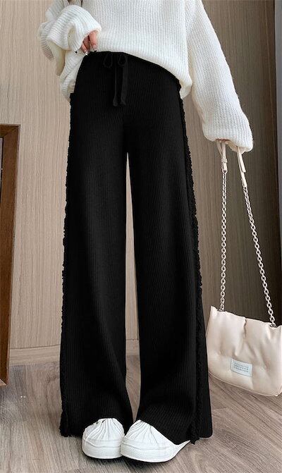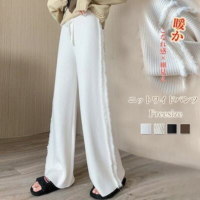ニットパンツ レディース リブニット ボトムス ワイドパンツ ロングパンツ フレアパンツ 秋冬 秋 冬 タッセル 伸縮性 春 ストレートパンツ ウエストゴム ニット リブ ゆるパンツ リラックス 楽ち