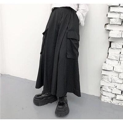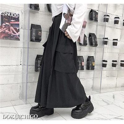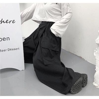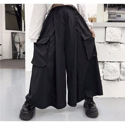 ワイドパンツ モード系 レディース カーゴ風 無地 黒 個性的 韓国