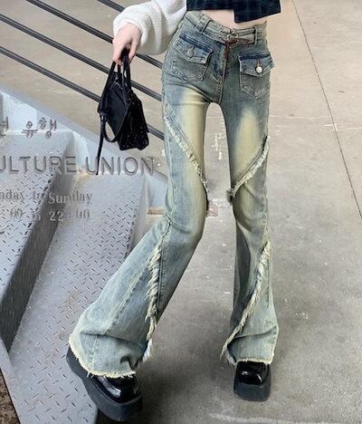 2024春夏 アメリカン パンツ デニム ブルー ジーンズ ロング丈 スキニー レッグ加工 ハイウエスト 脚長効果 美脚効果 細見え 秋 カジュアル 韓国ファッション お出かけ1