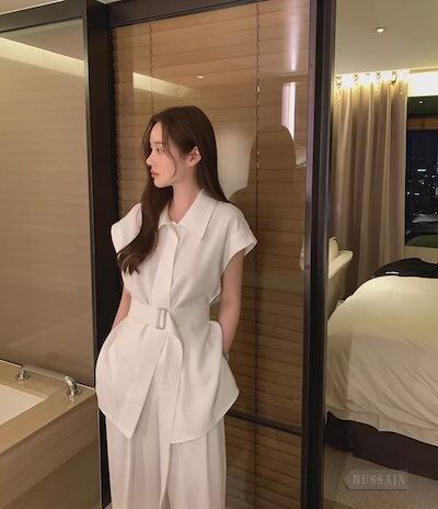 セットアップ トップス シャツ 半袖 襟 ベルト ロングパンツ ワイド ストレート 細見え ハイウエスト フォーマル きれいめ 大人っぽい おしゃれ 夏 韓国ファッション レディース お出かけ
