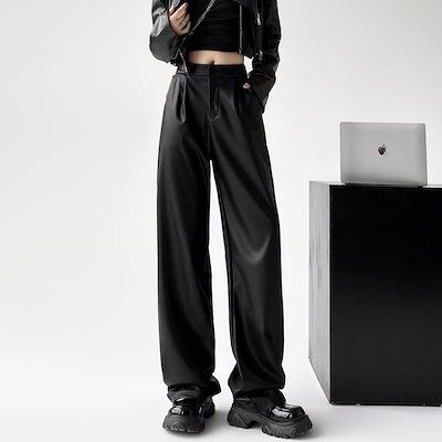 かっこいい!スラックスパンツPuレザーワイドパンツ 冬のボトムス レディース ハイウエスト PUレザー ワイドレッグパンツ ブラック コーヒー 秋 レトロ クール かっこいい おしゃれクリスマスコーデ