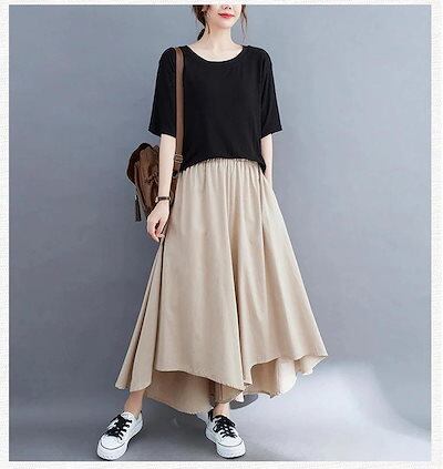 春夏 キュロットスカート 九分丈 ワイドパンツ 体型カバー ゆる 大きいサイズ 不規則裾 スラックス ゴム ハイウエスト レディース 袋付き ロングパンツ フレア メガ割